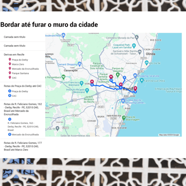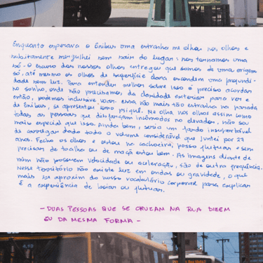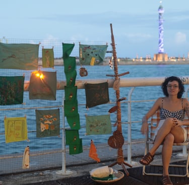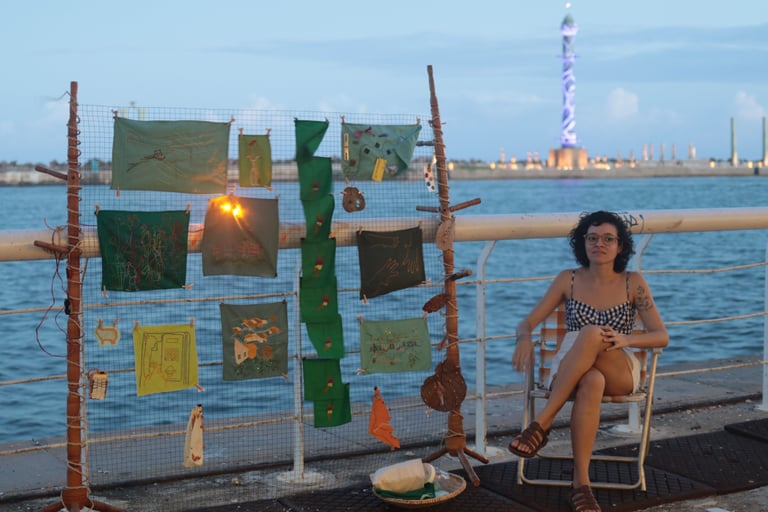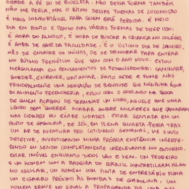 Esse projeto de pesquisa e criação foi desenvolvido através da Bolsa de Incentivo à Criação Cultural (BICC) da Universidade Federal de Pernambuco. Nele, me debruço sobre as etapas de concepção até a exposição de uma instalação artística com bordados realizados a partir do exercício de deriva na cidade do Recife, explorando os estímulos provenientes da interação entre corpo, cidade, arte e pesquisa. Um ZINE com imagens resultantes de derivas na cidade do Recife entre agosto de 2023 e março de 2024, traz textos que foram extraídos de diários de bordo que conduziram a pesquisa e as fotografias foram feitas durantes as caminhadas. Os bordados são imagens que surgiram da provocação que dá título à publicação: Bordar até furar o muro da cidade.