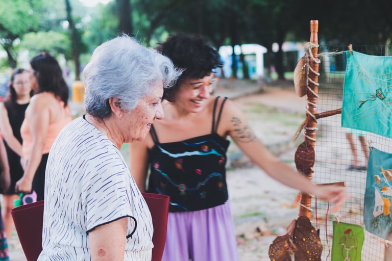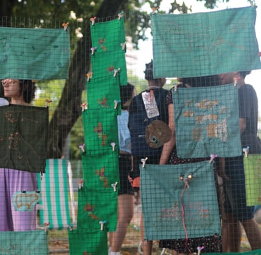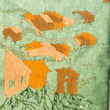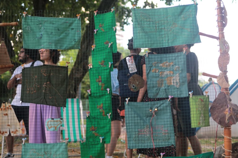 Assim como a cidade, o tecido é dotado de vida e, em um gesto de reverência, atravesso sua superfície num exercício de entrega. Na interação entre eu e o tecido, ocorre uma troca recíproca: eu me doo e em retribuição, ele me preenche de vida criativa. Esse ciclo de doação e preenchimento se assemelha à dinâmica da cidade. Com linhas e agulhas atravesso esse território buscando criar novas possibilidades de movimento fora do automatismo cotidiano.