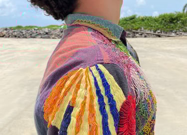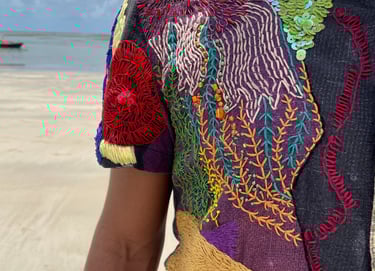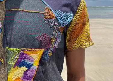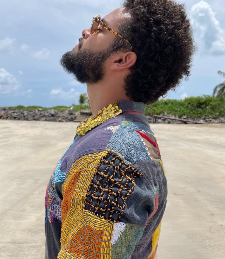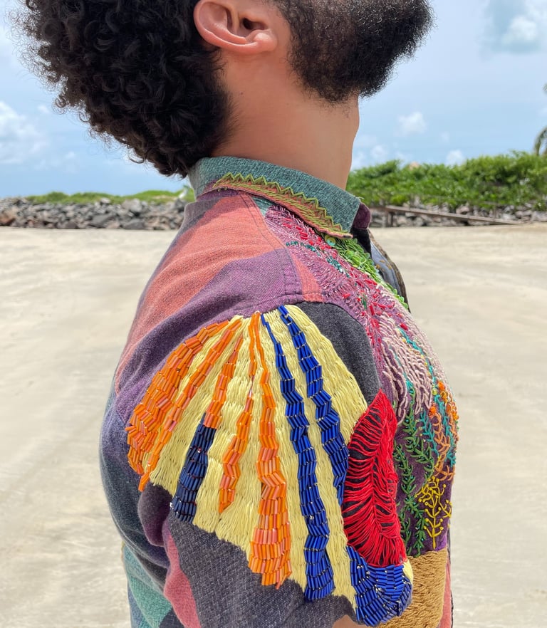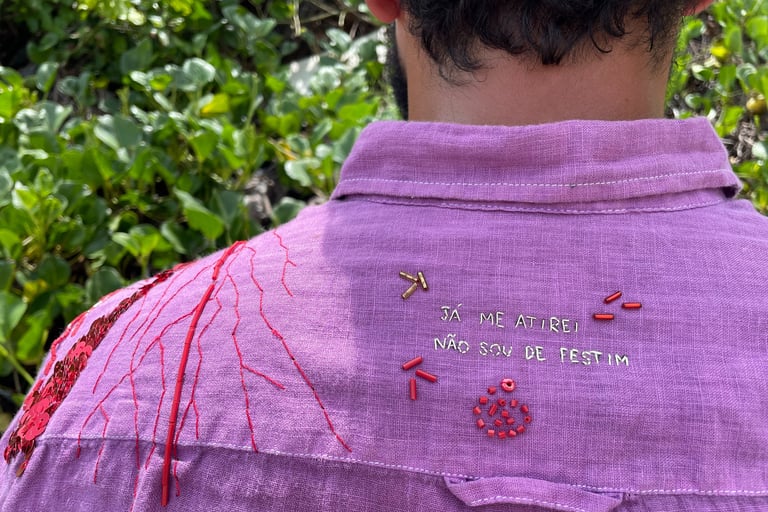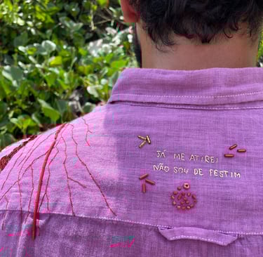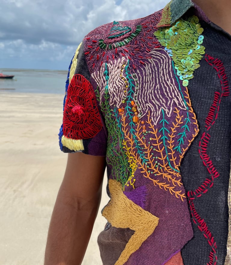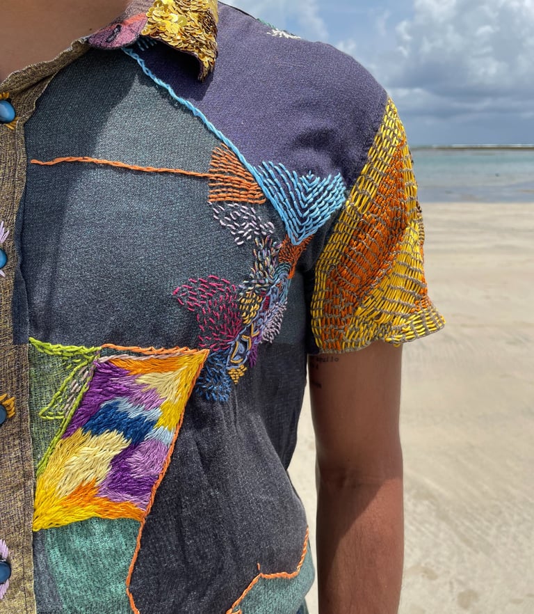 Para fazer um bordado como esse existe muita doação de si. Saliva para colocar a linha no buraco da agulha, furos nos dedos, dor nas mãos e assim o tecido vai nos acompanhando junto com as trocas de peles e dos dias. É sobre viver o tempo em toda sua duração possível, um ponto após o outro. Não é possível acelerar esse processo e é isso que eu mais amo no bordado. Trabalhar com tempo e com muito amor, mesmo que o capitalismo odeie isso.